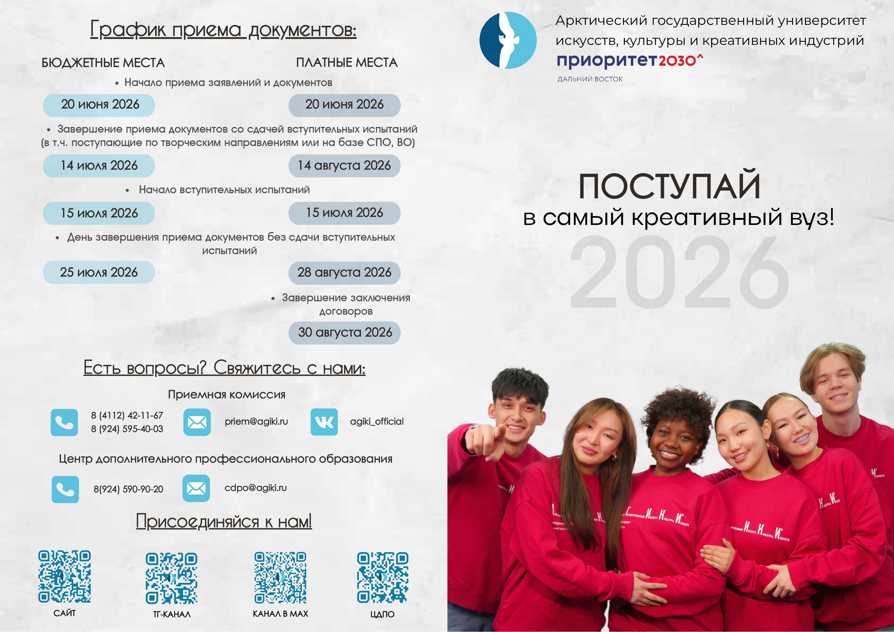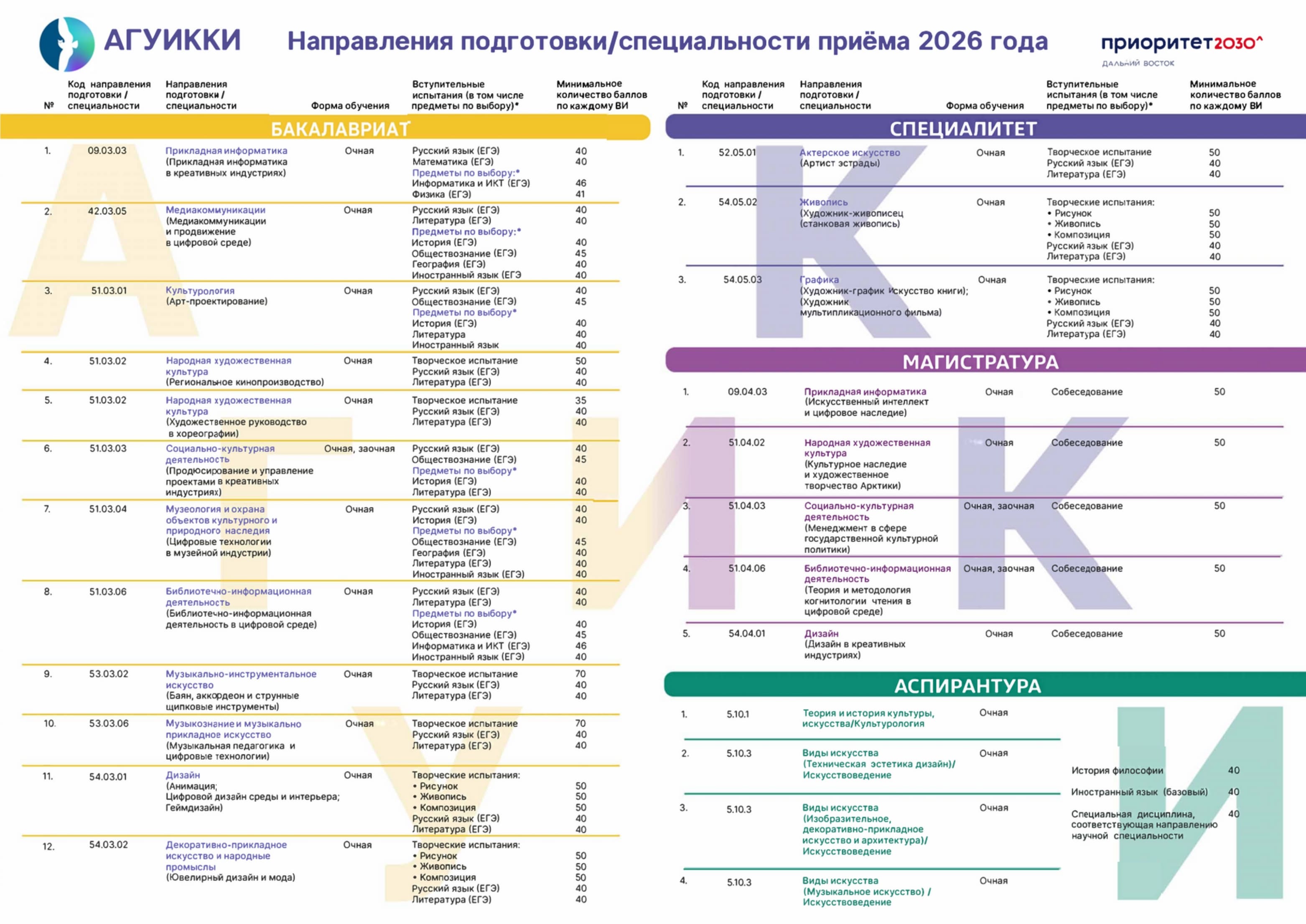 - Перечень направлений подготовки/специальностей ФГБОУ ВО «АГУИККИ», на которые проводится прием на обучение в 2026 году